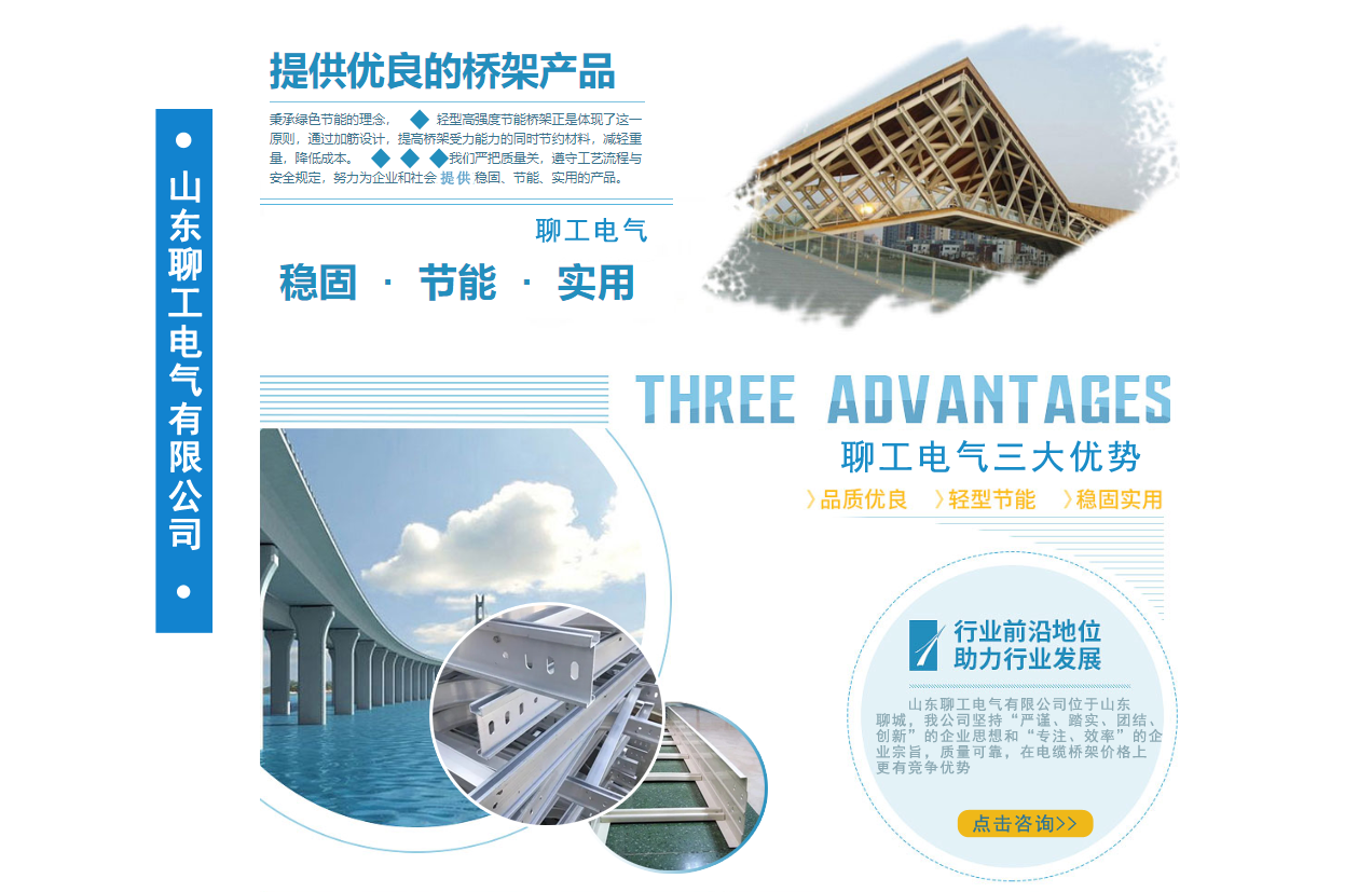 山東聊工電氣有限公司位于山東聊城,是一家銷售各類橋架的公司,公司主營(yíng)鍍鋅防火噴塑橋架,鍍鋅防火電纜橋架 ,不銹鋼電纜橋架,熱浸鋅電纜橋架,鋁合金電纜橋架,熱鍍鋅電纜橋架,梯式電纜橋架等我公司堅(jiān)持“嚴(yán)謹(jǐn)、踏實(shí)、團(tuán)結(jié)、創(chuàng)新”的企業(yè)思想和“專注、效率”的企業(yè)宗旨,質(zhì)量可靠,在電纜橋架價(jià)格上更有競(jìng)爭(zhēng)優(yōu)勢(shì)。公司追求品質(zhì),配有研發(fā)人員,進(jìn)行產(chǎn)品的改革和創(chuàng)新,服務(wù)先進(jìn)走出了一條富有企業(yè)特色的可持續(xù)化發(fā)展之路!    我公司鄭重向你承諾:保證最好的質(zhì)量,以低的價(jià)格,完善的售后服務(wù),來答謝新老客戶。可提前電話聯(lián)系。...